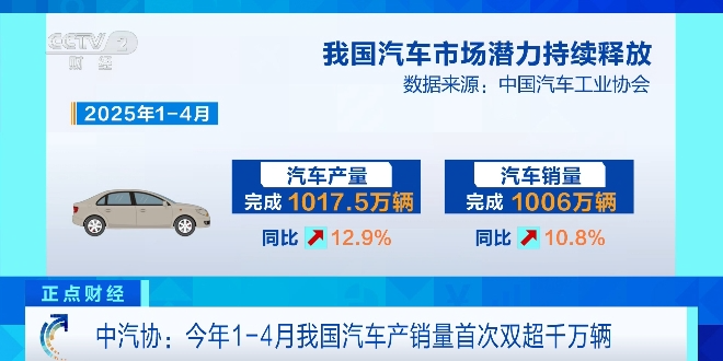 中国汽车工业协会今天(12日)公布的数据显示,今年前4个月,我国汽车产销量历史上首次双双突破1000万辆。